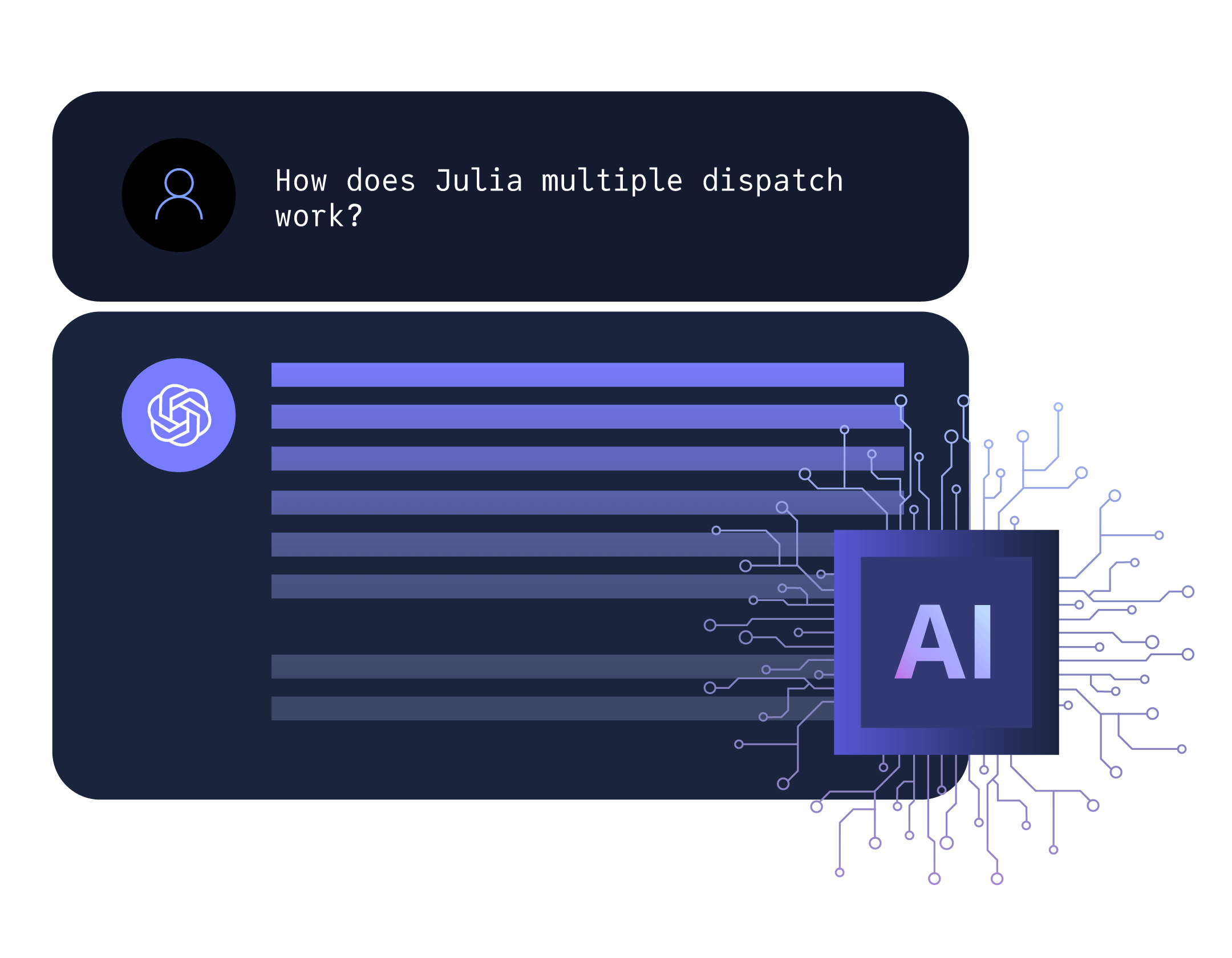 AskAI allows you to provide questions and prompts around Julia, Julia packages, and JuliaHub. Using our ChatGPT feature means you’ll have the full knowledge base of the Julia ecosystem at your fingertips with real coding examples and language guidance that will help you achieve the best results.