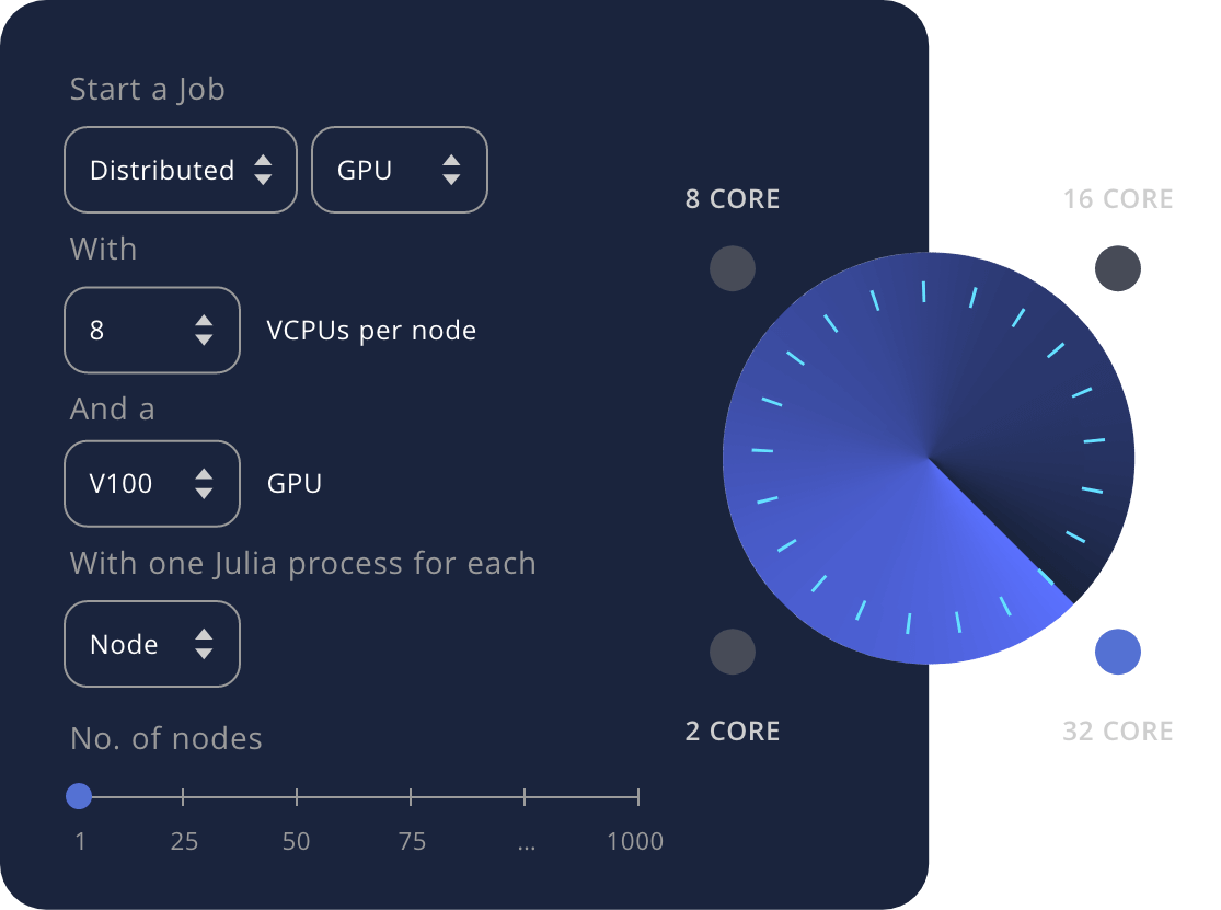 JuliaHub is the ideal place to run large scale computing in the cloud. Set configuration options for each individual workflow, adjust server specifications, and specify time and cost limits for running jobs.