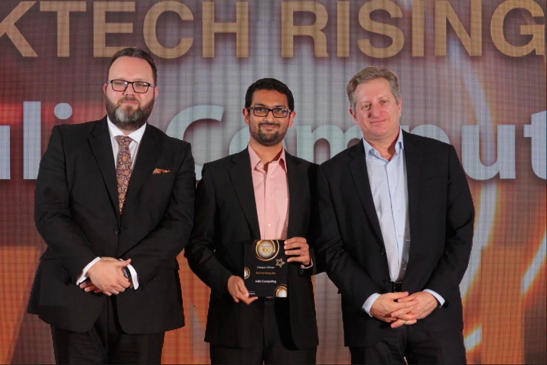 Julia Computing CEO Viral Shah (center) accepts RiskTech100 2018 Rising Star Award from Chartis Research Head of Research Rob Stubbs (left) and Neuberger Berman Senior Portfolio Manager Steve Eisman (right)