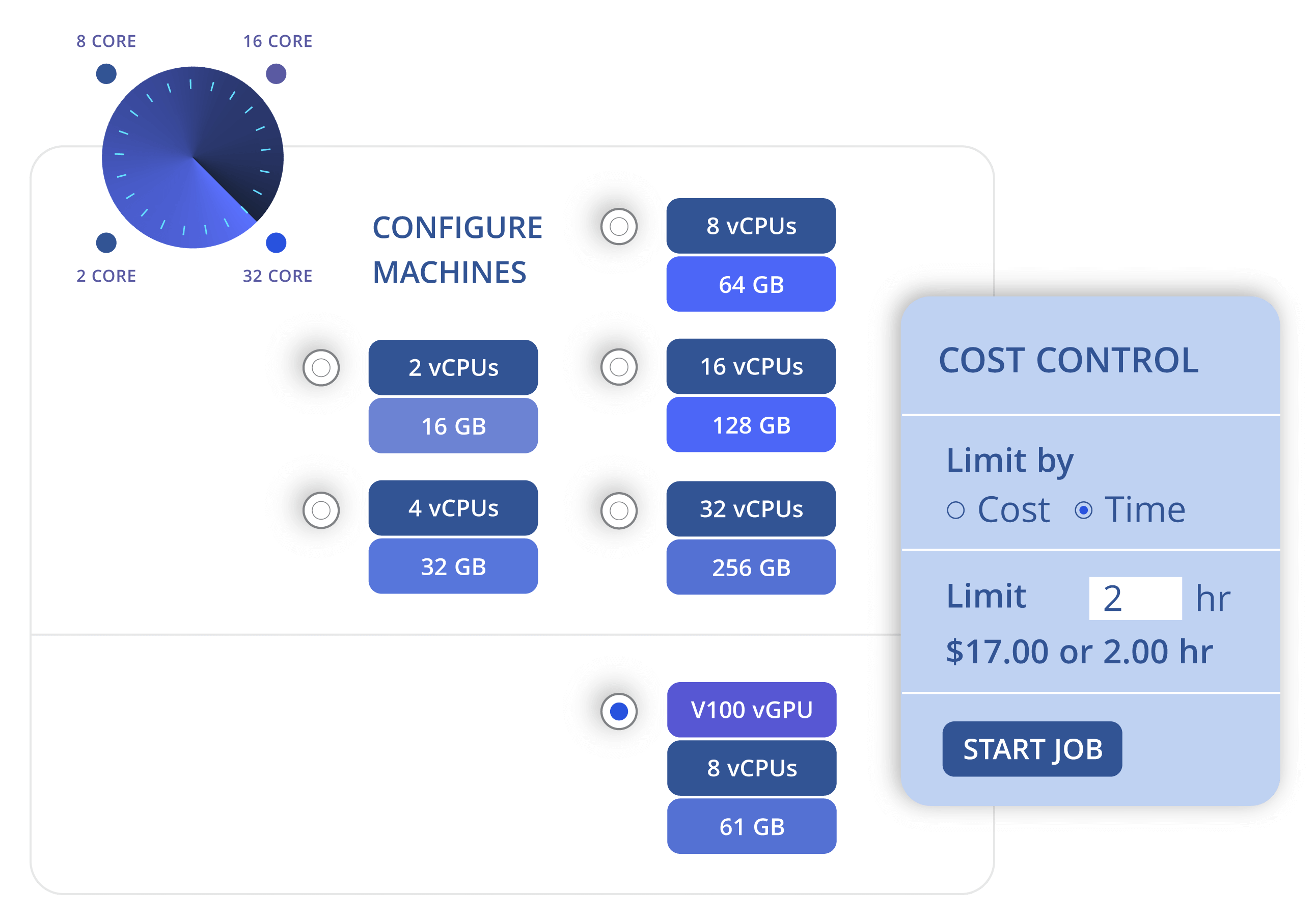CloudStation is a configuration feature that allows admins to manage High Performance Virtual Machines. Run jobs with hundreds of nodes in parallel. Choose a machine type to run multiple processes at once and configure resources to manage costs. Turn your laptop into a supercomputer.