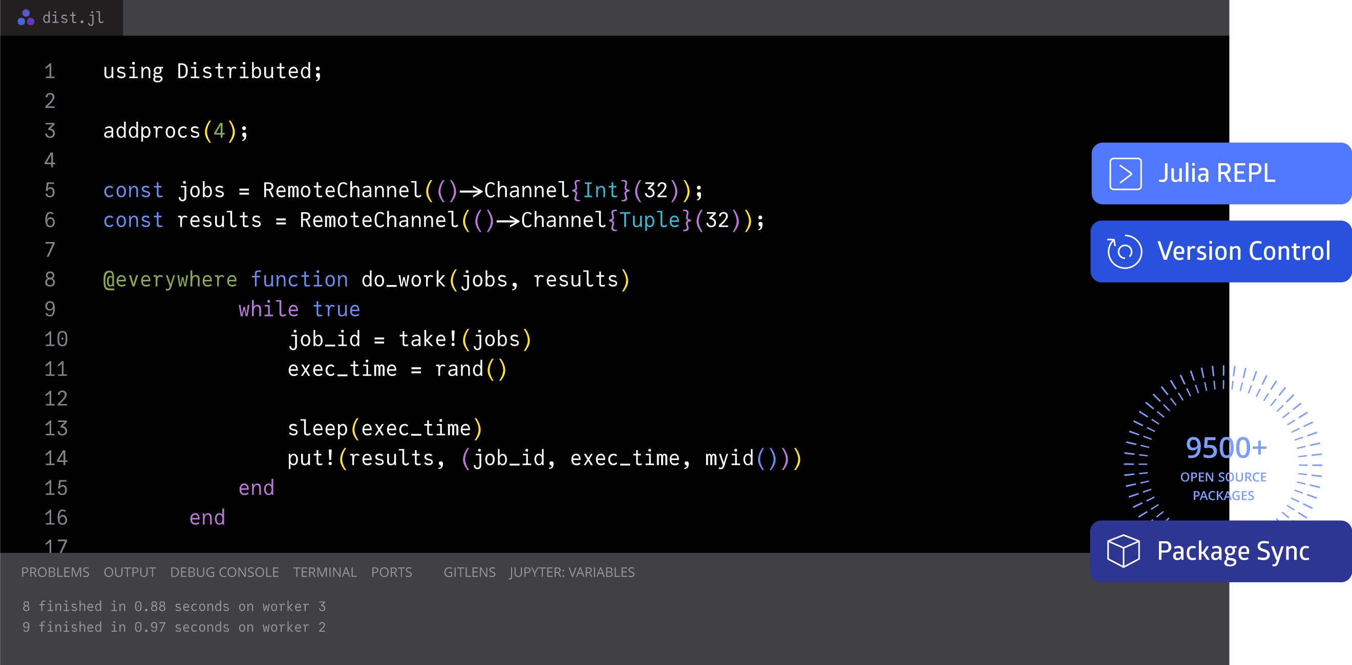 Advanced Package Manager with dependency management and version control built-in. Combined with private registry management tools to store proprietary and custom packages. Checkout some of our most impressive packages built by the vast array of open source developers and technical programmers in the Julia ecosystem.