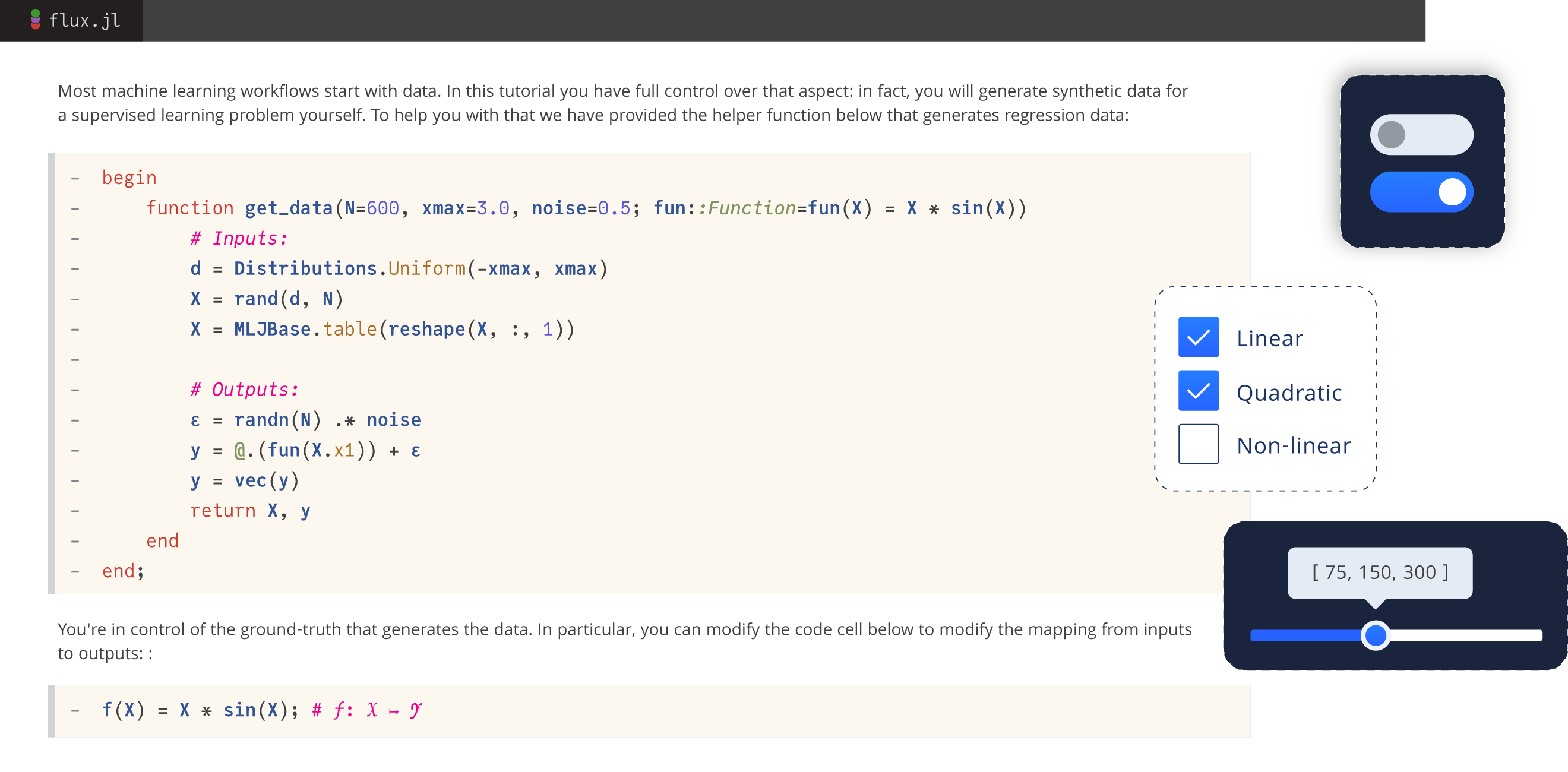 Pluto understands variable links between code cells, and will re-run a cell when a dependency changes, giving you a fast and fun way to experiment with your model.